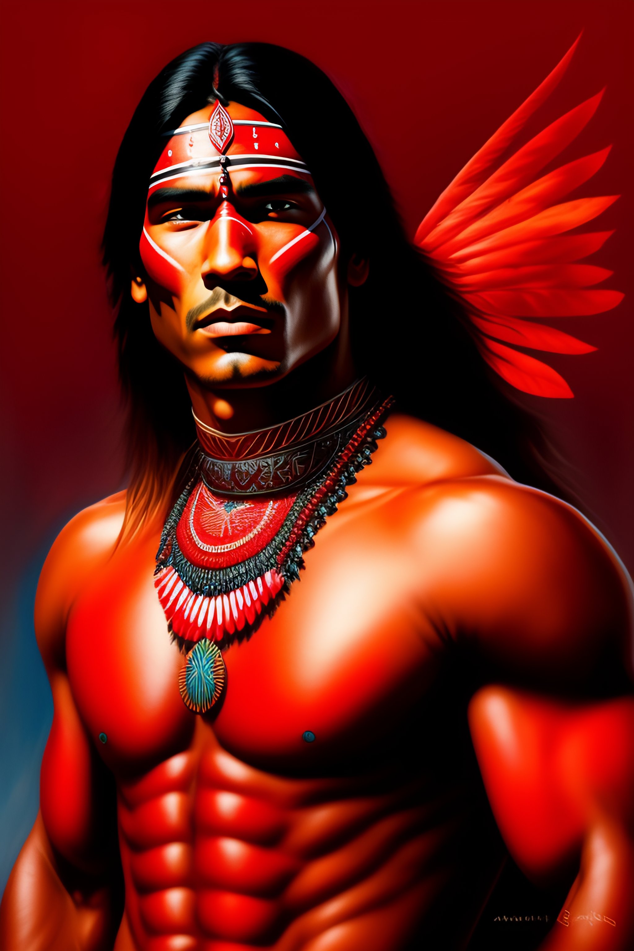 Lexica Native american warrior painted in red body paint with an eye shaped amulet in his neck short hair highly detailed digital painting spl Very well made.