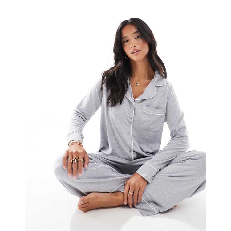 ASOS DESIGN Petite Pigiama super morbido con camicia a maniche lunghe e pantaloni grigio con profili a contrasto ASOS Very well made.