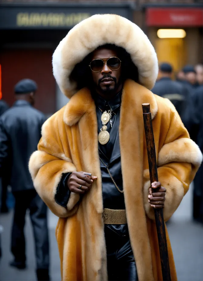 Lexica a real person in high quality photography picture looking like a black pimp with black leather clothes and a white fur coat and walk stick in his hand Very well made.